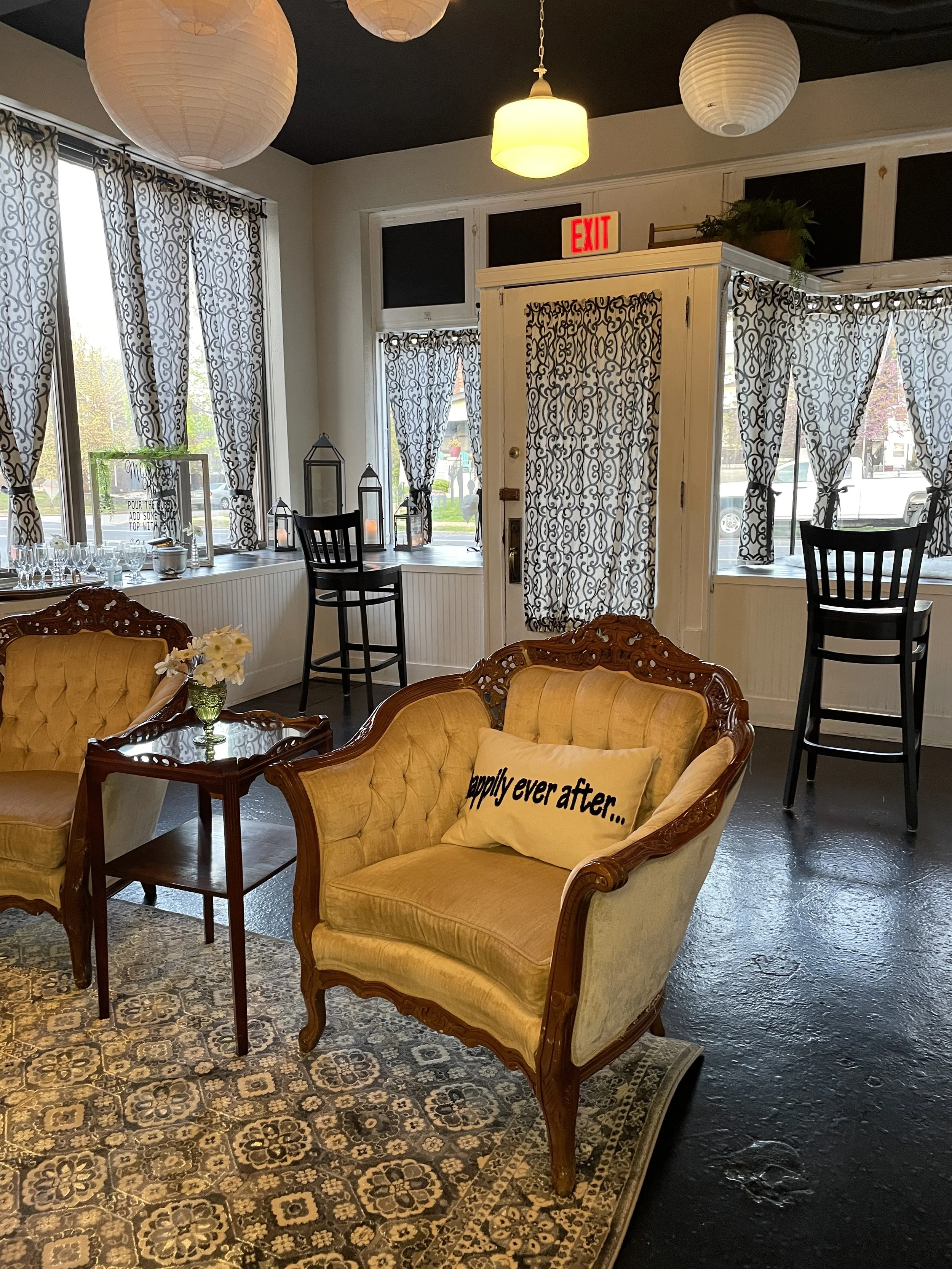 Cozy restaurant interior with vintage yellow armchairs, a small side table with flowers, large patterned curtains, hanging paper lanterns, and windows with decorative curtains. A door with an exit sign and black bar stools are also visible.