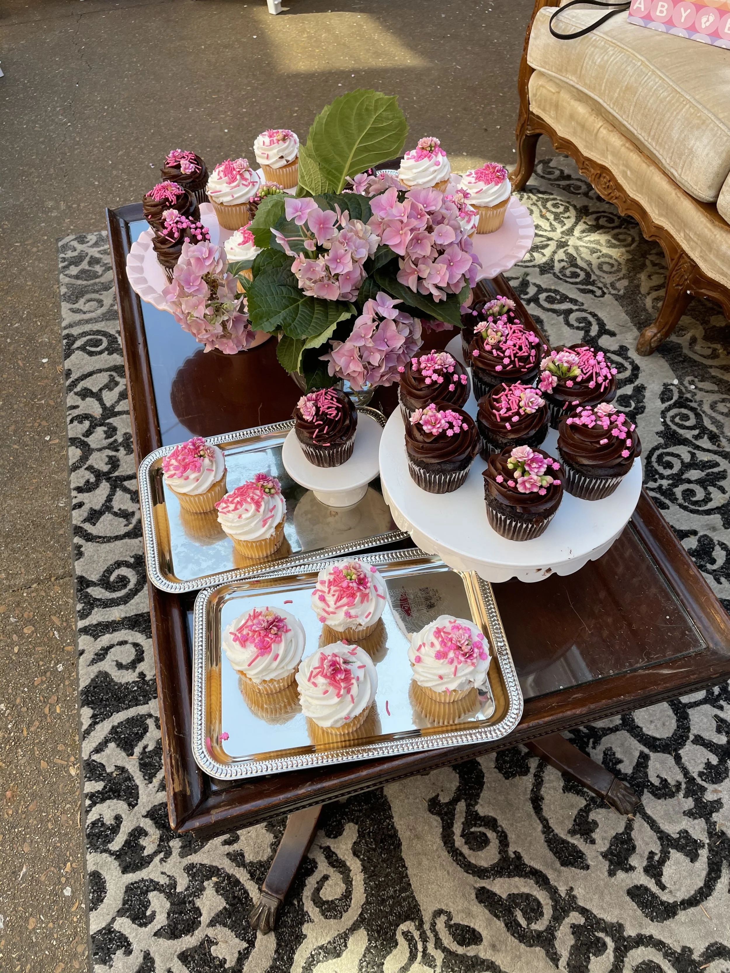 Cupcakes with pink and white frosting and sprinkles on silver trays, decorated with pink hydrangea flowers on a wooden table.