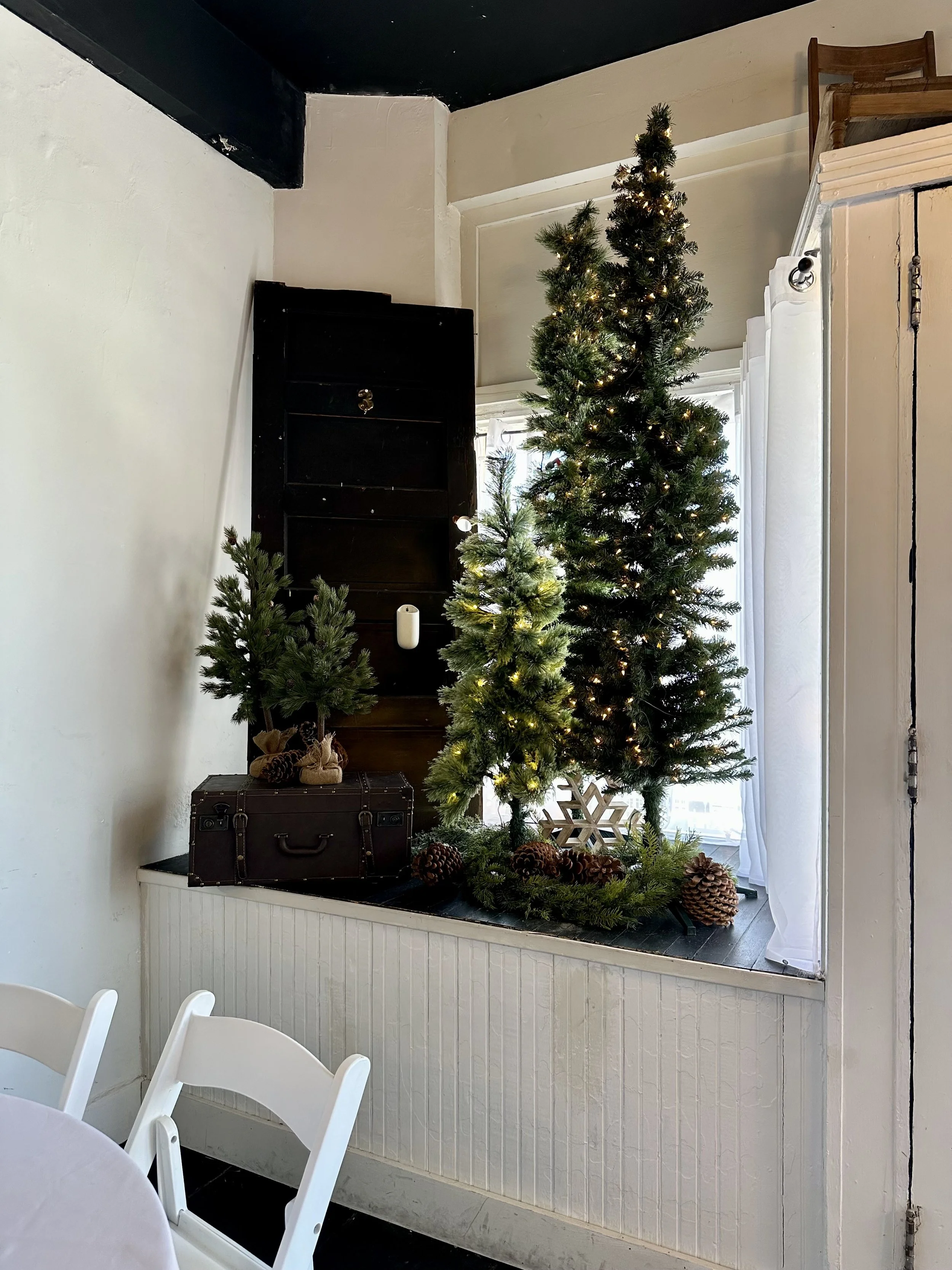 Decorated Christmas trees on a windowsill with pinecones and a wooden star, inside a cozy room with white walls and curtains.