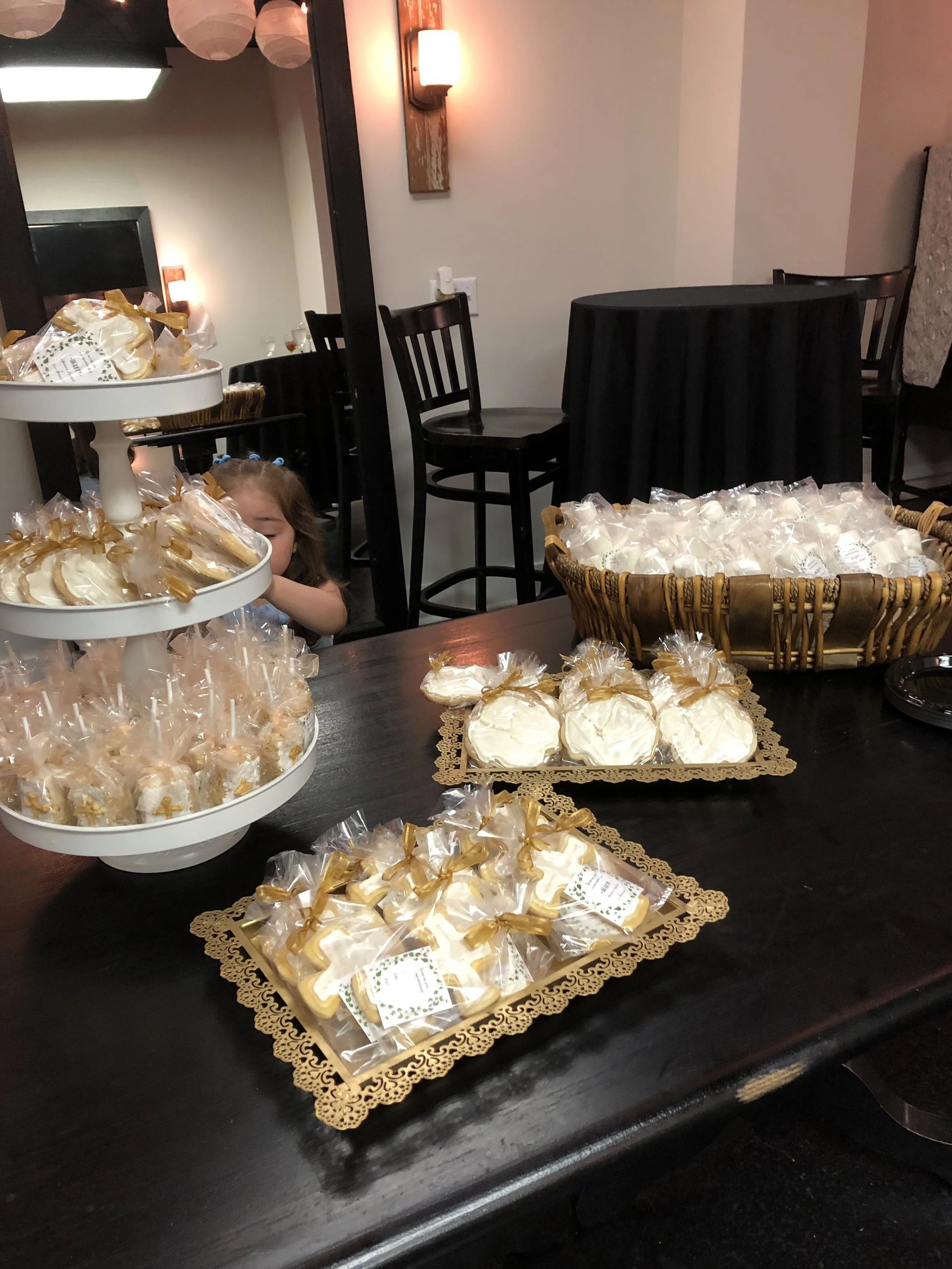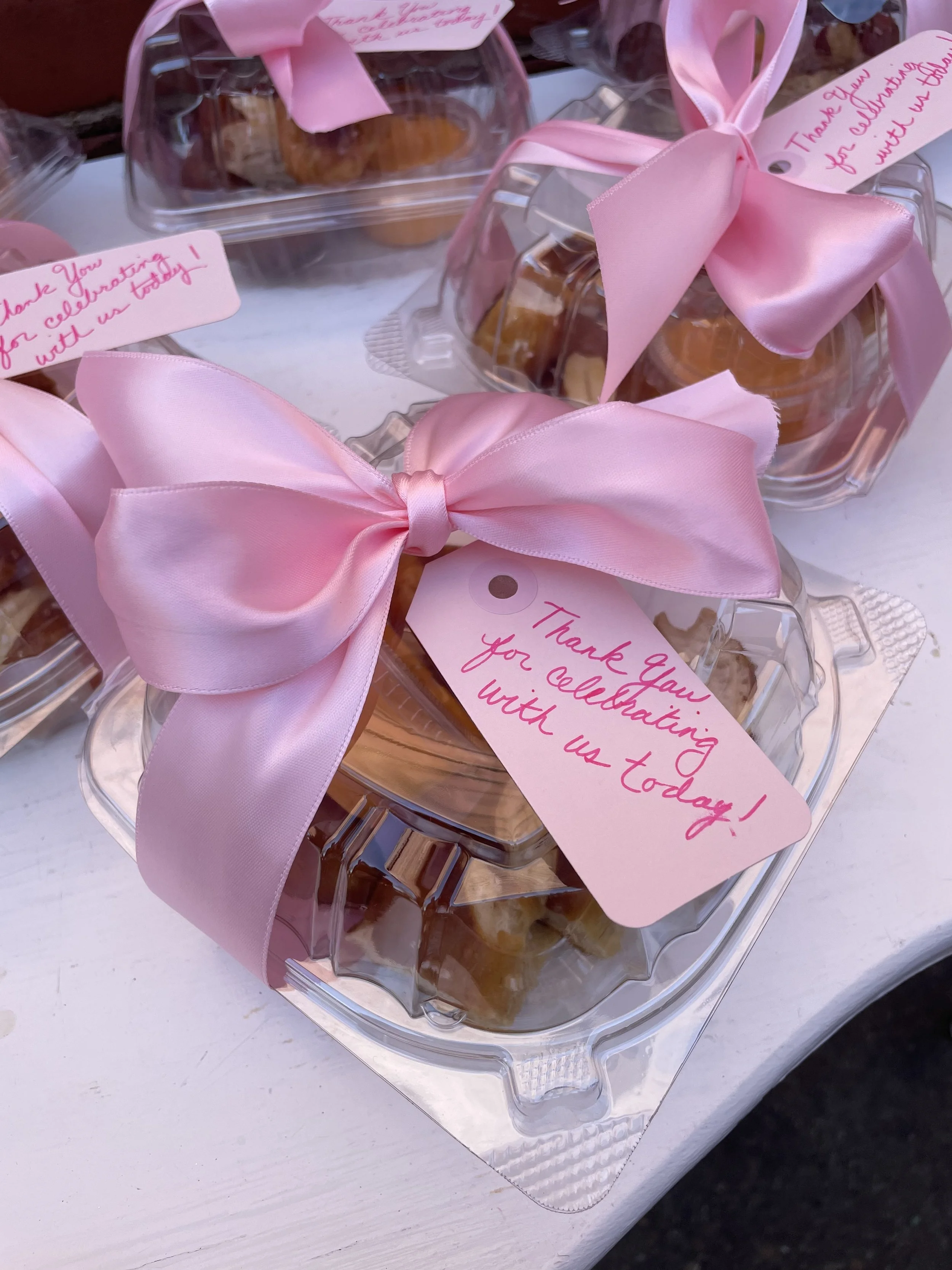 Clear plastic gift boxes filled with baked goods, decorated with large pink satin ribbons and pink thank you tags.