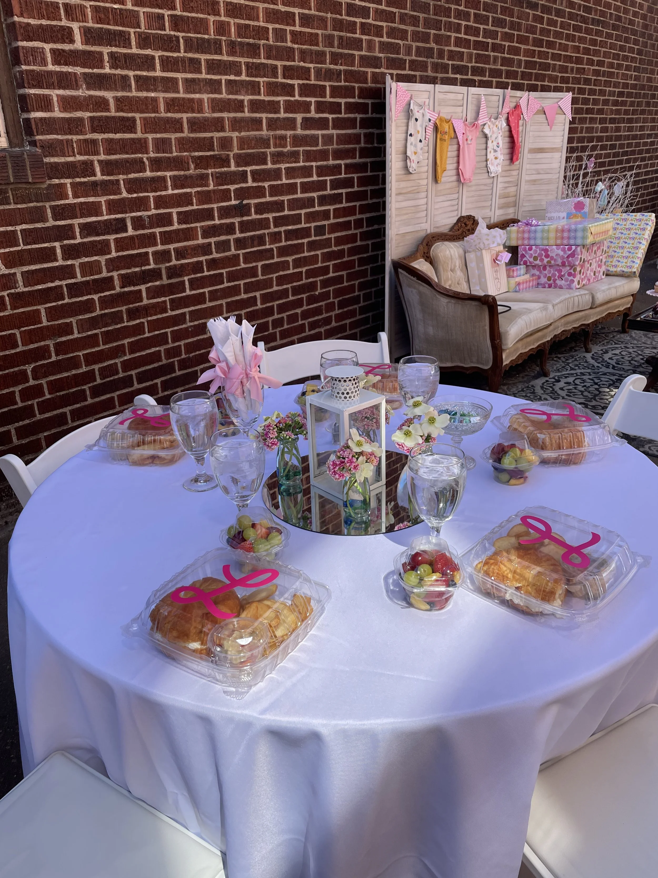 A birthday party setup with a round table covered with a white tablecloth, set with plastic containers of cookies and grapes, glass cups, and a floral centerpiece, located outdoors against a red brick wall with a vintage sofa decorated with baby clot