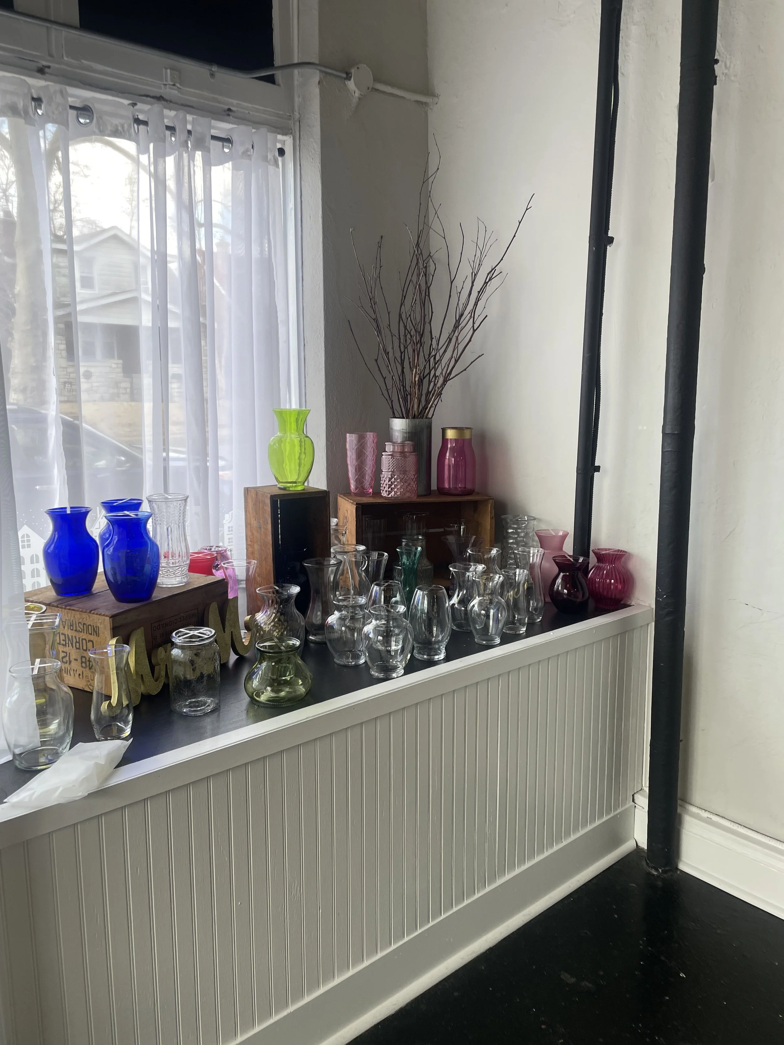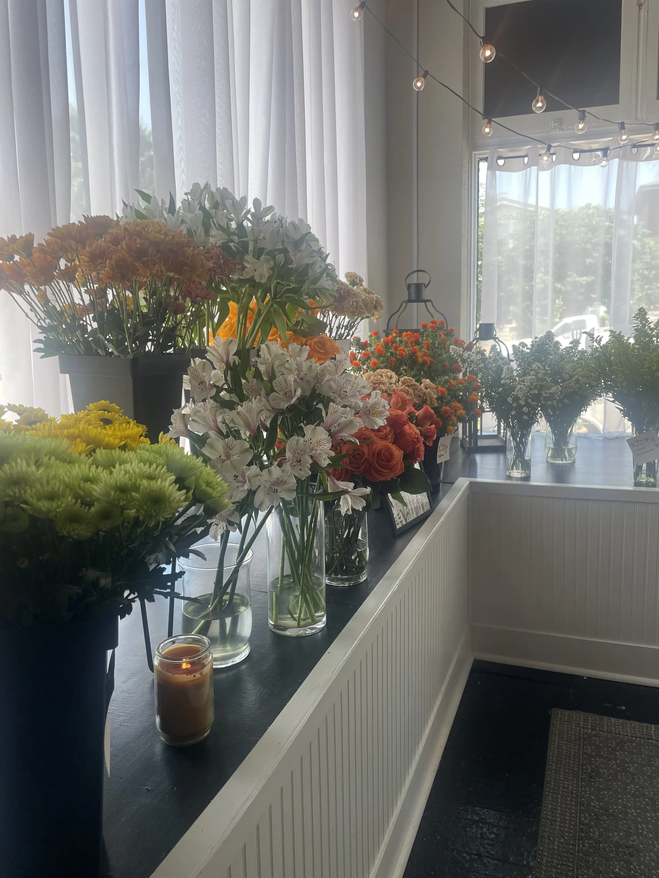 Various colorful flowers in glass vases arranged on a window sill with sheer curtains, string lights hanging overhead, and a lantern in the background.