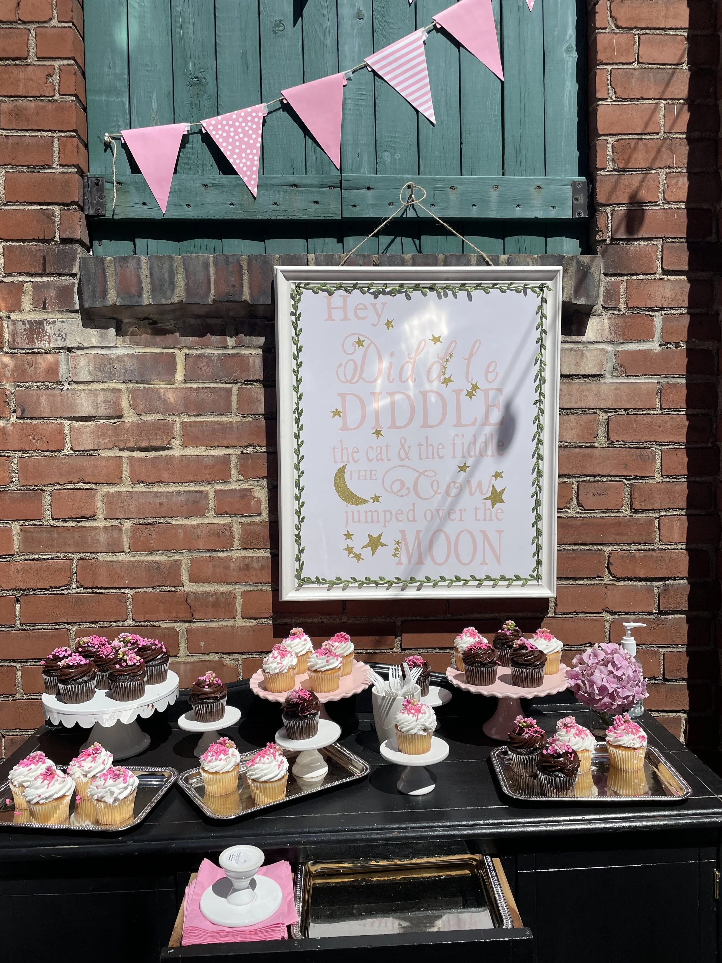Cupcakes with pink and white frosting and pink decorations on silver trays, set against a brick wall with a framed sign that reads "Hey Diddle Diddle the cat & the fiddle the cow jumped over the moon," decorated with pink and white bunting.