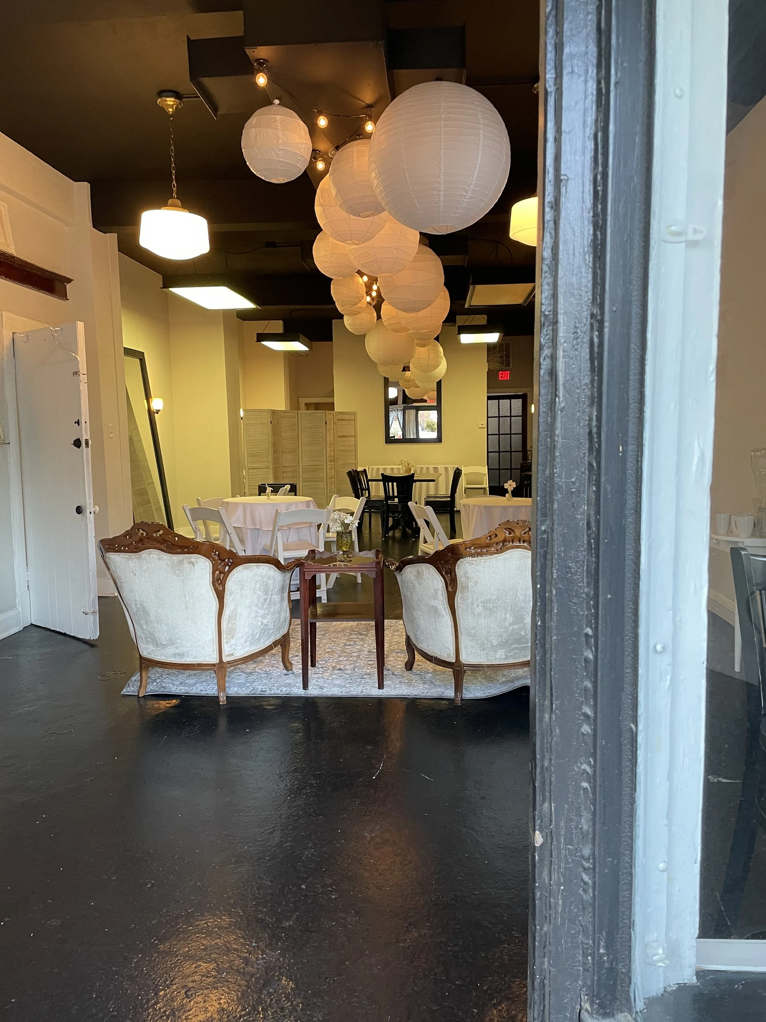 Inside view of a cozy restaurant or cafe with vintage armchairs, hanging paper lanterns, round dining tables with white tablecloths, and a wooden partition, seen through an open door.